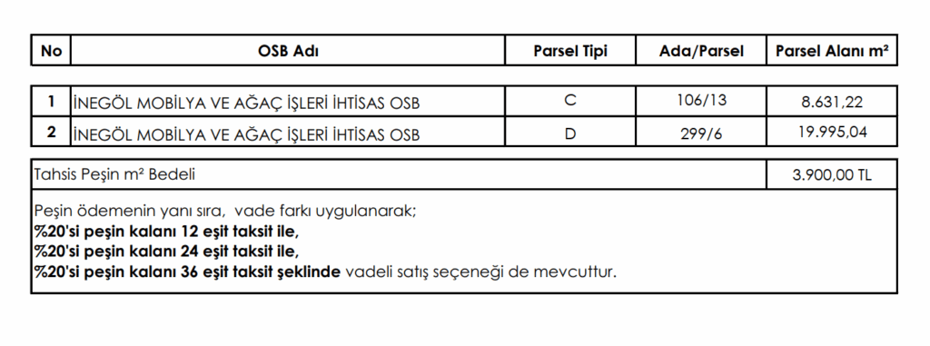 Mülkiyeti İnegöl Mobilya ve Ağaç İşleri İhtisas Organize Sanayi Bölgesi’ne (İMOSAB) ait Bursa İli, İnegöl İlçesi, Hamzabey Mahallesi (299/6) ve Yenişehir İlçesi Çayırlı Mahallesi (106/13) sınırları içerisine isabet eden aşağıdaki tabloda bilgileri yazılı sanayi parselleri tahsis edilecektir.