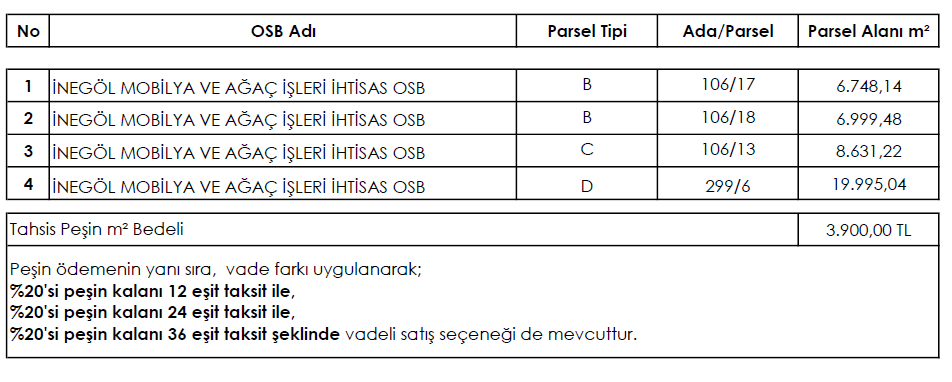 Mülkiyeti İnegöl Mobilya ve Ağaç İşleri İhtisas Organize Sanayi Bölgesi’ne (İMOSAB) ait Bursa İli, Yenişehir İlçesi, Çayırlı Mahallesi (106/17), (106/18), (106/13) ve Bursa ili, İnegöl ilçesi, Hamzabey Mahallesi (299/6) sınırları içerisine isabet eden aşağıdaki tabloda bilgileri yazılı sanayi parselleri tahsis edilecektir.